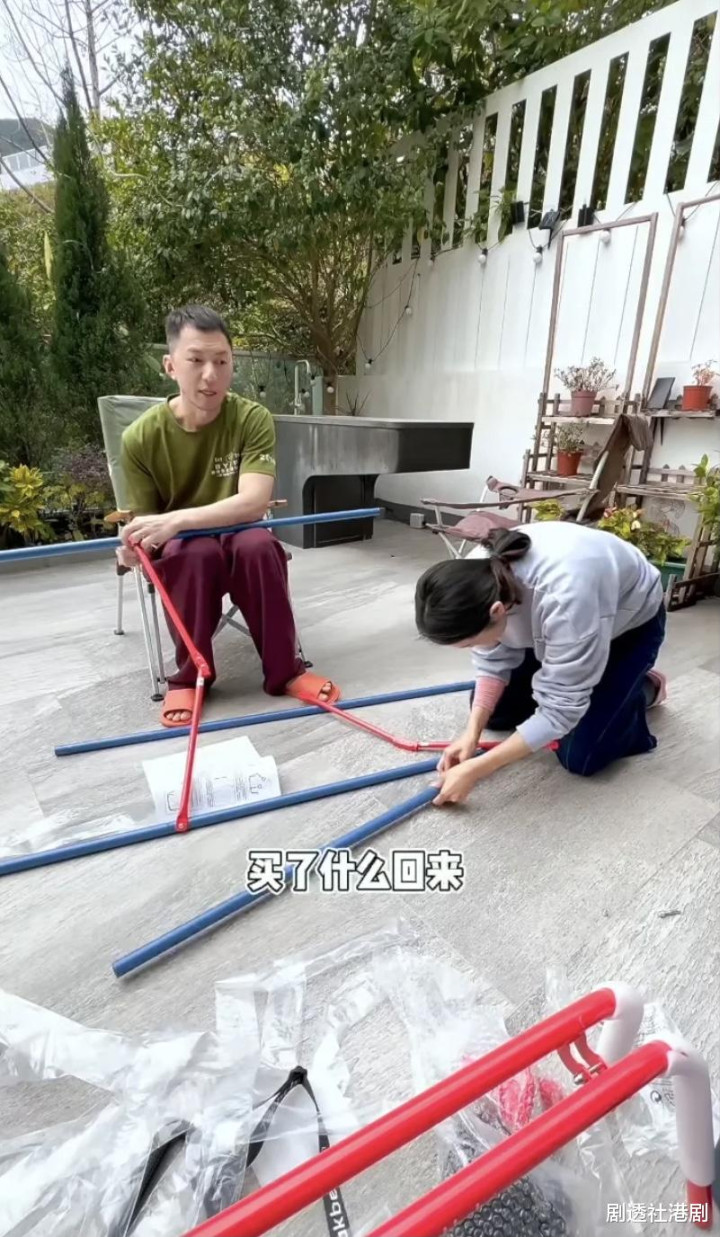 短片中的张宝儿和老公袁伟豪一起在组装一个秋千,虽然这个秋千组装的过程不是很繁琐,但是也需要一定的时间。